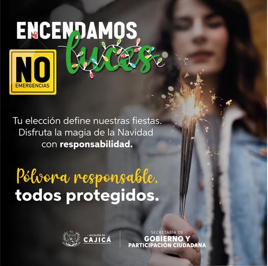 La Administración Municipal invita a la ciudadanía a sumarse a la campaña Encendamos Luces, No Emergencias, una iniciativa que promueve una celebración responsable durante la temporada decembrina, priorizando la protección de la niñez, el bienestar animal y la reducción de emergencias médicas e incendios asociados al uso inadecuado de pólvora.