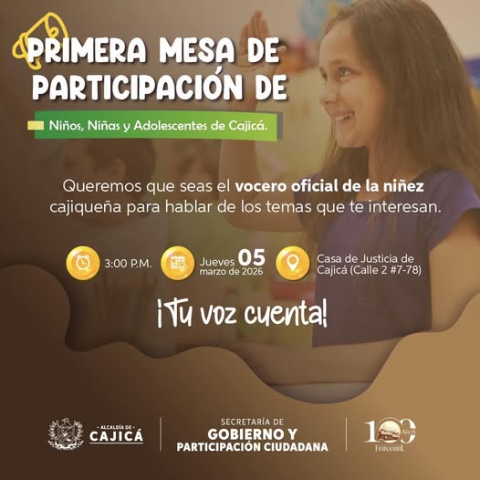 La Administración Municipal invita a participar en la primera Mesa de Participación de Niños, Niñas y Adolescentes, un espacio creado para que la niñez y la adolescencia del municipio tengan un vocero oficial y puedan expresar sus ideas, opiniones y propuestas.