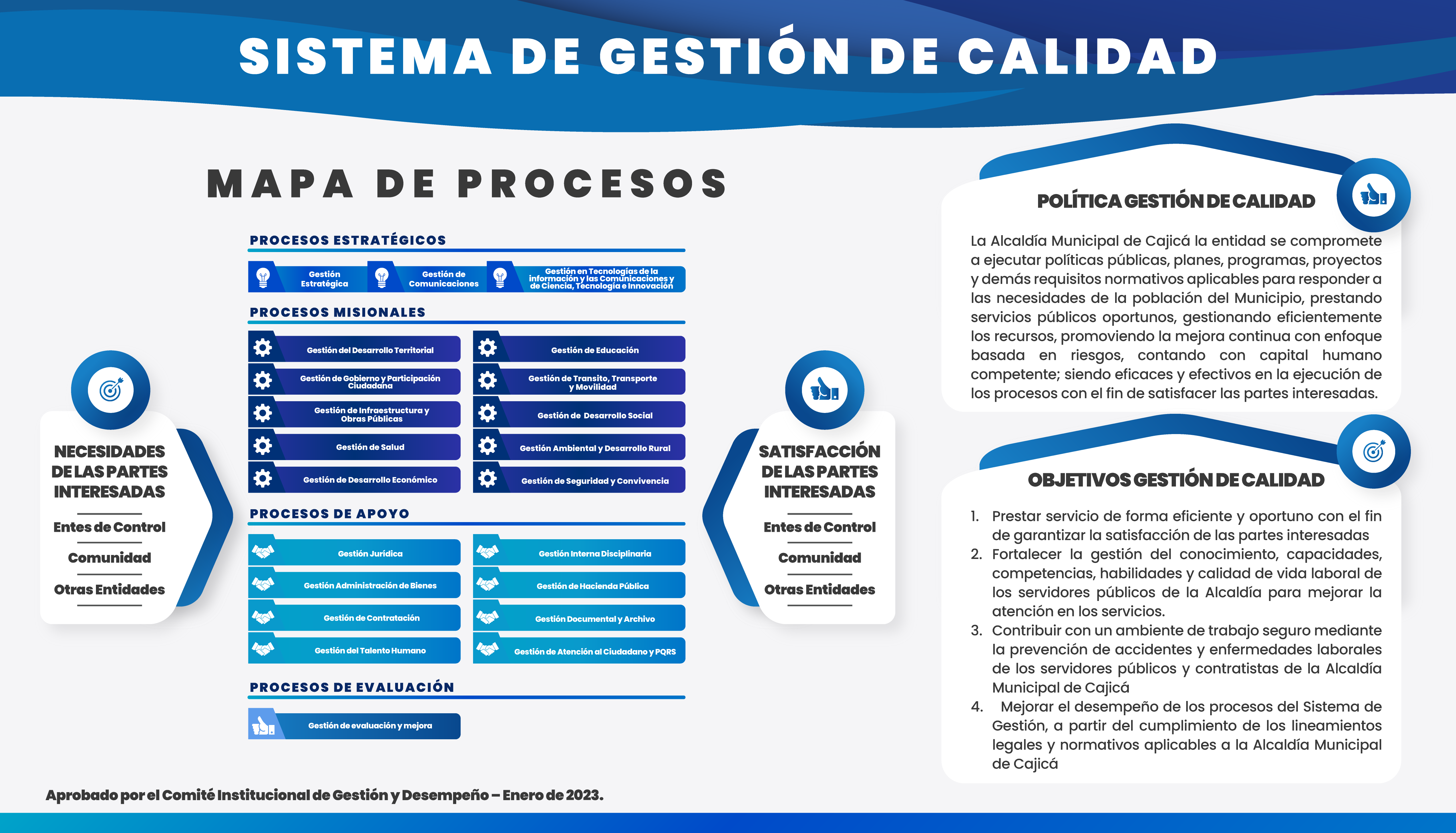 Es la herramienta integral para la planificación, implementación, control y seguimiento de Sistemas de Gestión de Calidad de la Alcaldía de Cajicá. A través de esta herramienta se puede consultar los procesos y procedimientos documentados.
