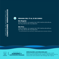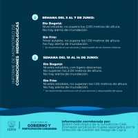Para la semana del 17 al 21 de junio, el río Bogotá ha mantenido niveles estables, con un ligero aumento moderado respecto a semanas anteriores, acompañado de lluvias moderadas menores a 10 mm. Por su parte, el Río Frío ha registrado niveles estables, no superando 1 metro con 50 centímetros, con presencia de lloviznas también moderadas.