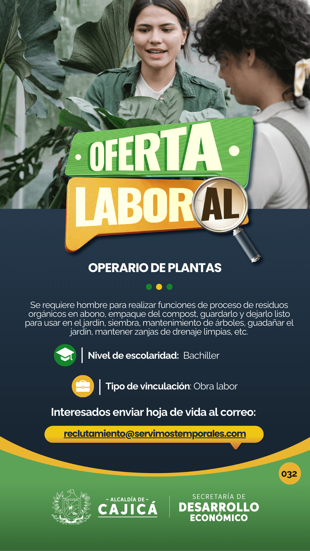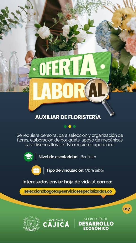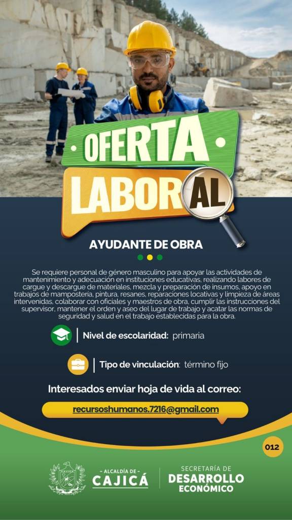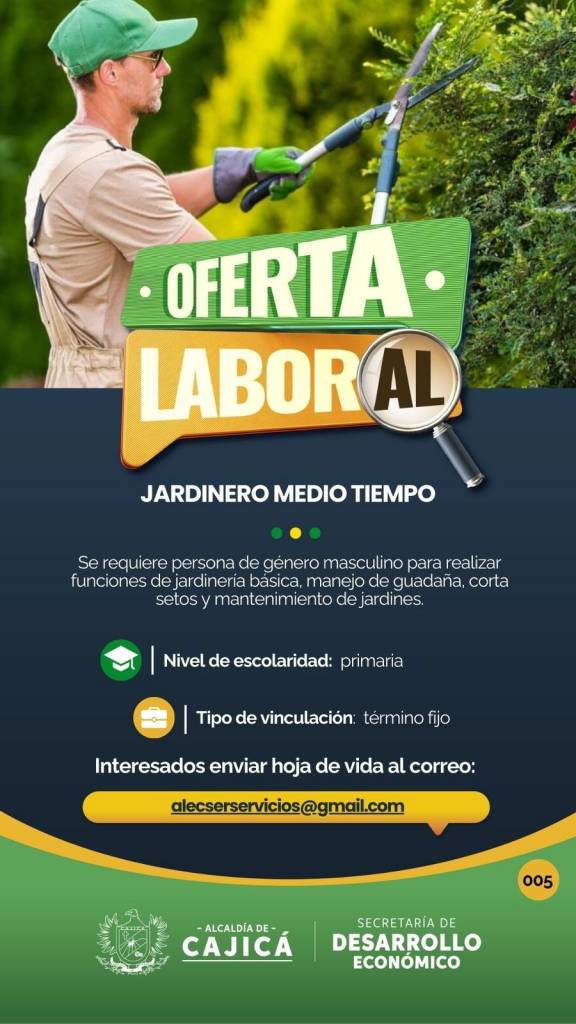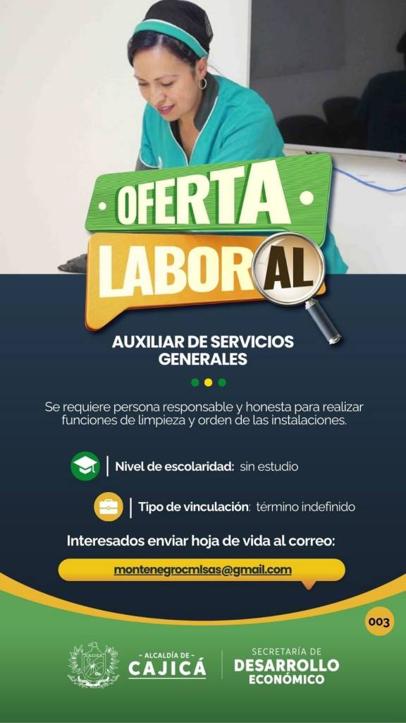 Servicios generales, para realizar funciones de aseo en las oficinas y áreas asignadas, clasificar la basura empacados desechos orgánicos papeles y materiales y materiales sólidos en bolsas separadas entre otros. Auxiliar de mantenimiento, para realizar funciones de supervisar el óptimo funcionamiento de la caldera, realizar las tareas de mantenimiento correctivo, preventivo y programado conforme al programa del trabajo establecido y elaborado por el jefe inmediato entre otros.