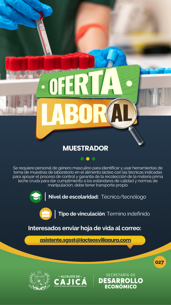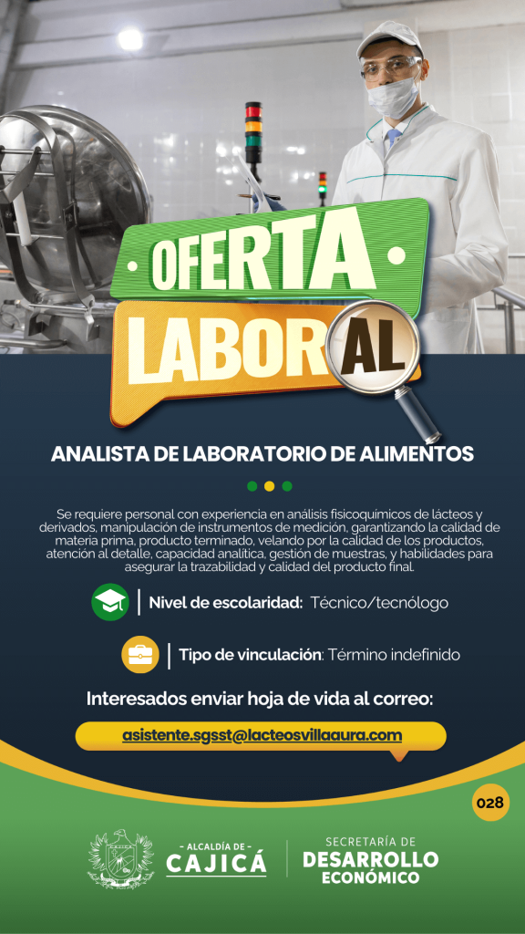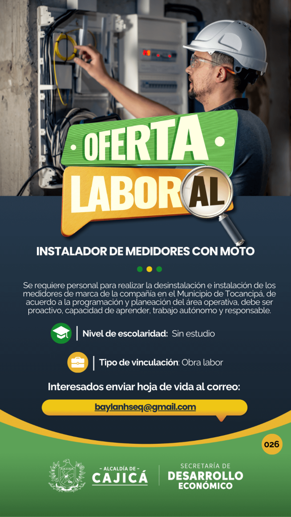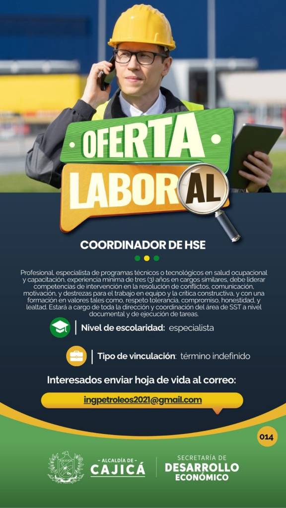 Se requiere para diseño de sistemas de riego (hidráulico, eléctrico y automatización), cotización de material y proyectos, apoyo técnico y administrativo al área de ingeniería, contratación directa por contrato laboral a término indefinido, experiencia mínima de un año en diseño de sistemas de riego, residencia en Cajicá o municipios cercanos, con disponibilidad para desplazarse a Tabio.