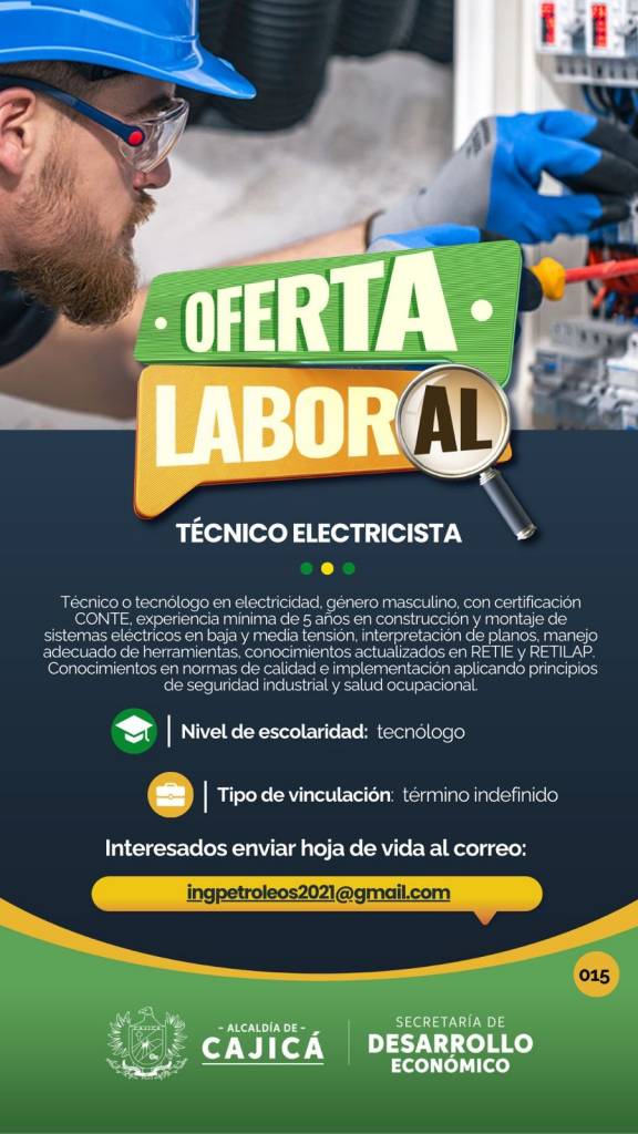 Experiencia mínima de 1 año como electricista, tarjeta CONTE vigente (obligatoria), conocimientos en mantenimiento eléctrico industrial, manejo de herramientas eléctricas y equipos asociados, sera responsable de ejecutar labores de instalación, mantenimiento preventivo y correctivo, diagnóstico y reparación de sistemas eléctricos, responsable de la interpretación básica de planos eléctricos, manejo de herramientas y equipos especializados, detección y solución de fallas, apoyo en montajes eléctricos en diferentes frentes de trabajo. Debe contar con alta disposición para el trabajo en campo.