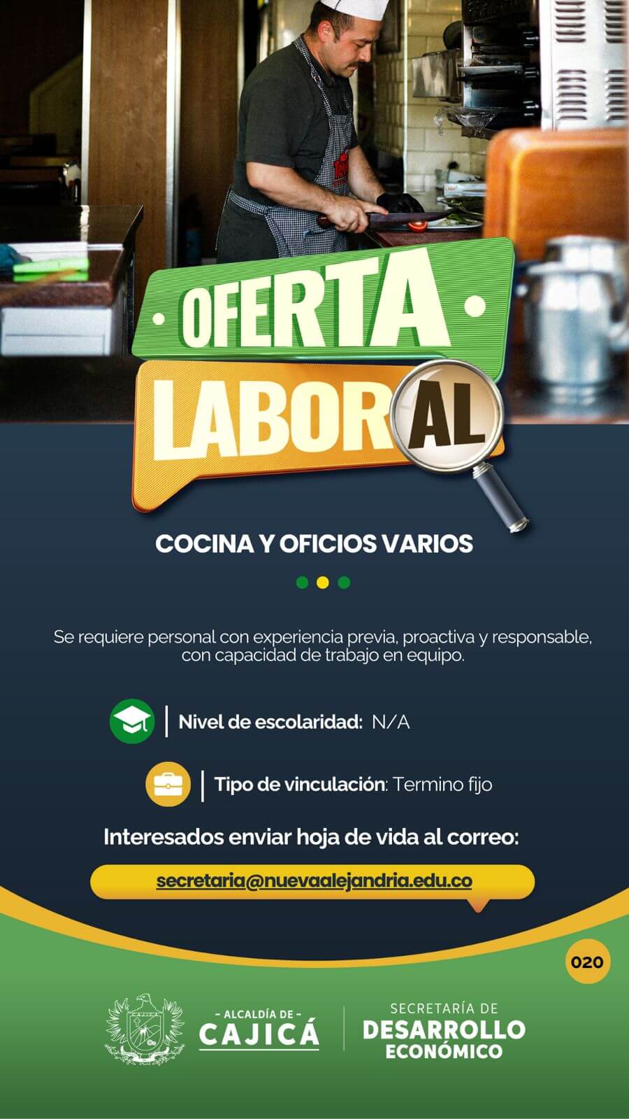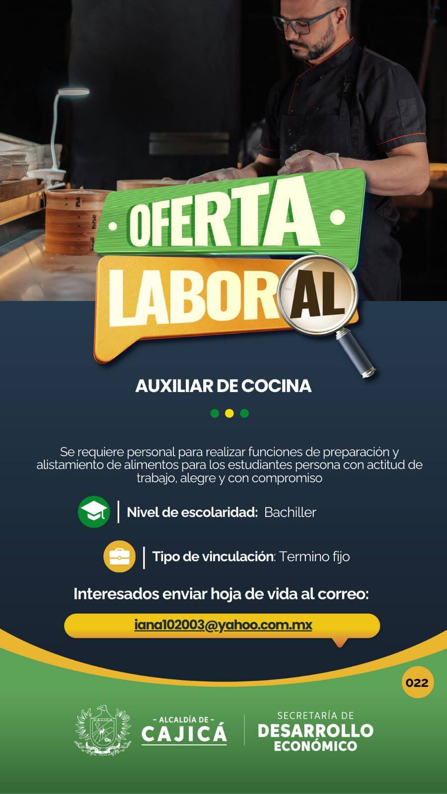Se requiere con experiencia de 1 año, en preparación de ensaladas, entradas frías, salsas y repostería, horario de martes a domingo.