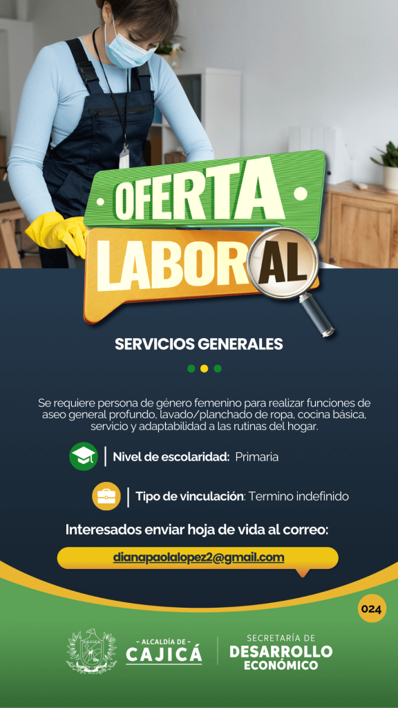 Se requiere personal femenino para ejecutar labores de aseo y desinfección en áreas de hospitalización, aseo y desinfección de las instalaciones locativas, realizar labores de limpieza en general, recolectar residuos hospitalarios y disponerlos según normas, registrar operaciones en formatos establecidos, entre otros.
