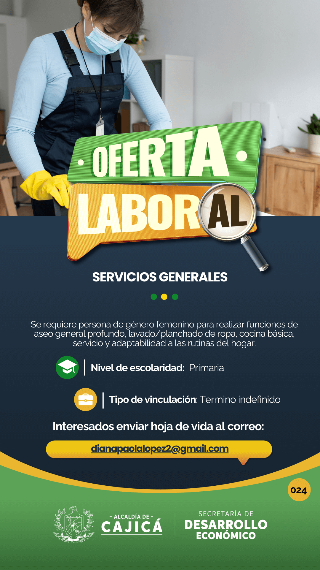 Se requiere persona de género femenino responsable para realizar funciones de limpieza y desinfección de áreas, diligenciamiento de planillas de limpieza y desinfección, realizar solicitud de los insumos del área a trabajar.