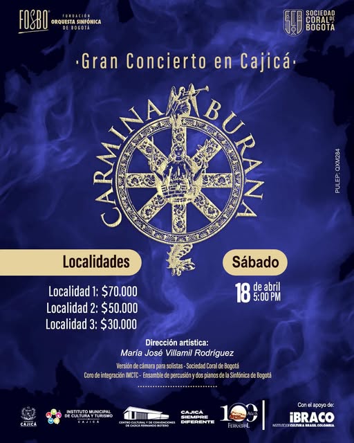 Después de presentaciones con localidades agotadas en Bogotá, Carmina Burana llega por primera vez al Centro Cultural de Cajicá en una imponente versión coral que reúne a más de 80 artistas en escena.